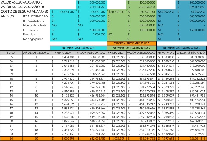 CUARTO: Estructure el seguro con un experto en seguros de vida que trabaje con varias aseguradoras y le presente algo así, que permita de verdad comparar y entender que compras y si estás pagando lo justo, hoy y en 1, 2 o 15 años: